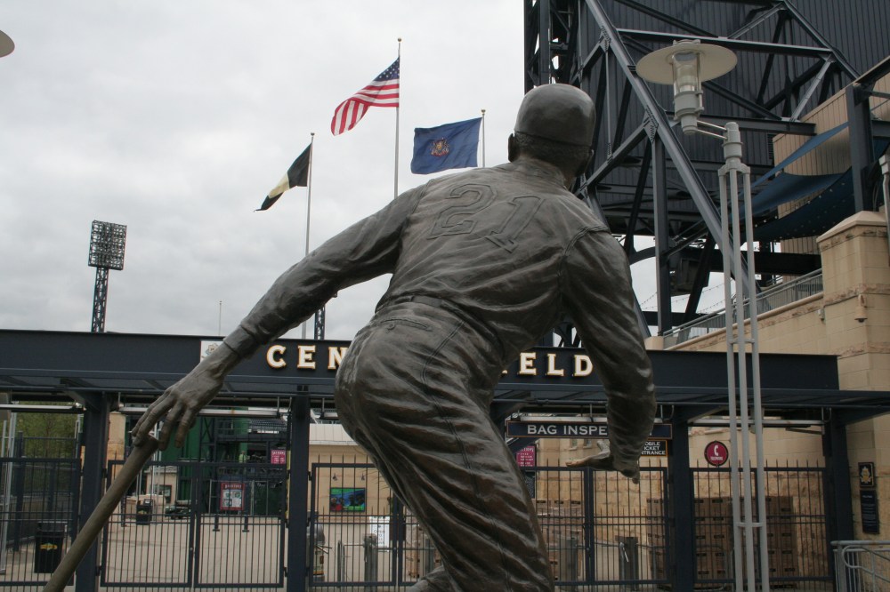 Then there are the Pirates, who with a beautiful new ballpark are mired more than 50 games behind the division-leading Phillies in the National League East. I got a glimpse of the exterior of PNC Park yesterday on a visit to Pittsburgh, and I had just enough time to shoot these photos and a few others of the impressive statues of Willie Stargell and Roberto Clemente outside the gates.