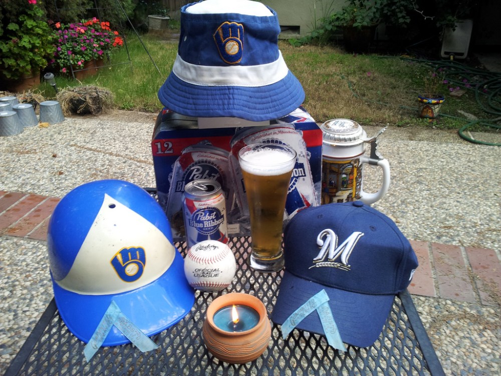The blue ribbons adorning the bills of the batting helmet and the modern Brewers cap, purchased a few years ago at Miller Park, are authentic ribbons from old Pabst bottles that my wife found for me at an antique store in Milwaukee.