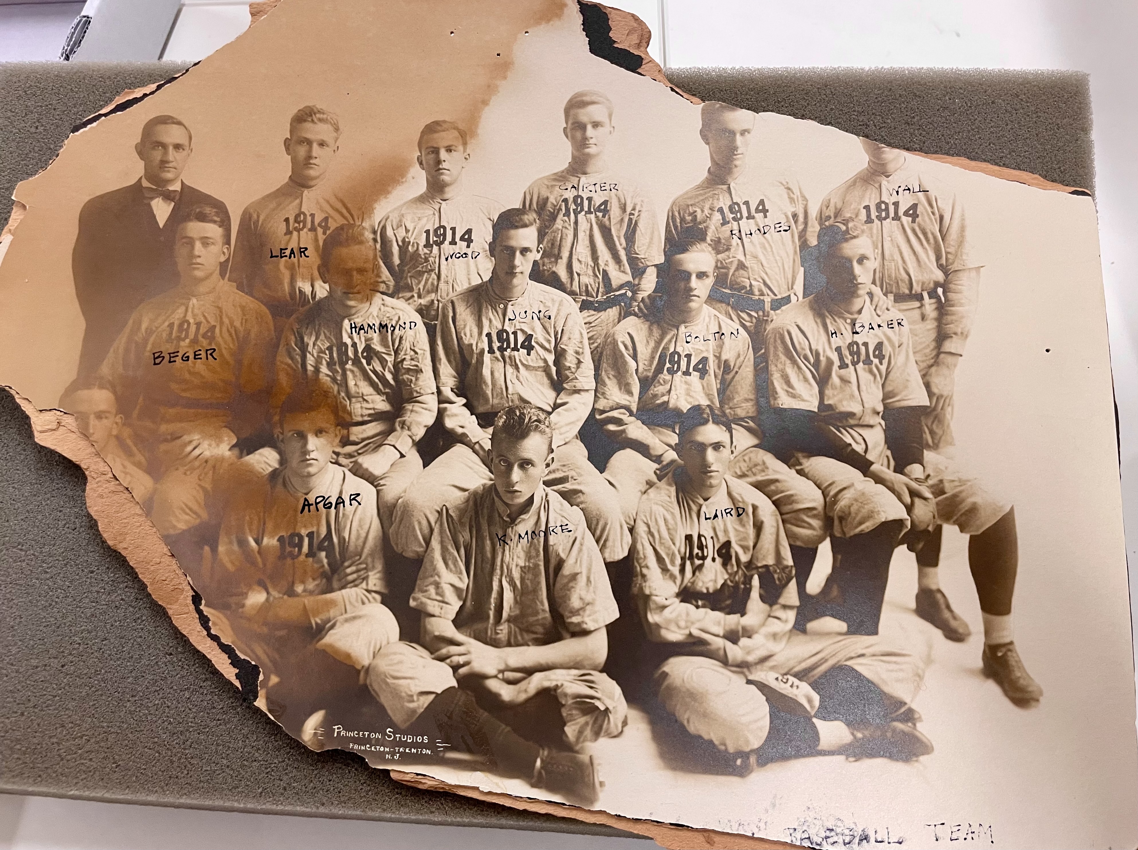 In the late 19th and early 20th centuries, Princeton was a powerhouse in collegiate baseball, and we saw several artifacts spanning those decades. Included were a tattered 1914 photograph of the freshman baseball team, which included Hobey Baker, a star football and hockey player in whose honor the annual collegiate hockey player of the year award is named. There was a shellacked baseball commemorating an intramural ballgame between the classes of 1876 and 1874. The photograph at the top of this post is of what is believed to be a cap that an alumnus wore to a Class of 1928 reunion.